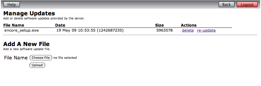This page (see screenshot 1) allows you to see the update files that are available to clients, to add new files, and remove existing ones.