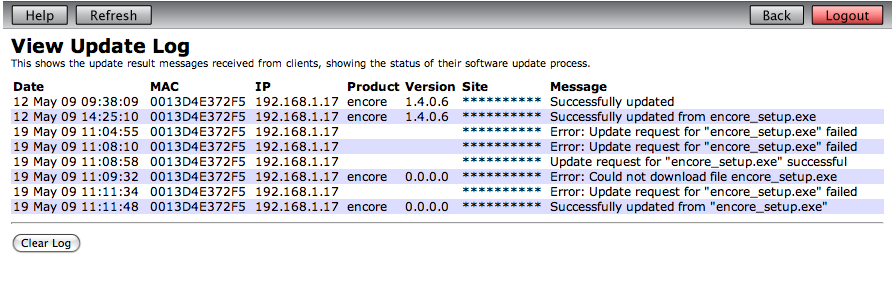 The update log (see screenshot 2) shows reports from client applications, showing the results of software update operations. After each update attempt, the client app will send a message to the service saying whether the update was completed successfully, or failed for some reason. This is useful to see whether updates have been successfully deployed to computers on the network, and if any computer had a problem and was unable to perform the update.